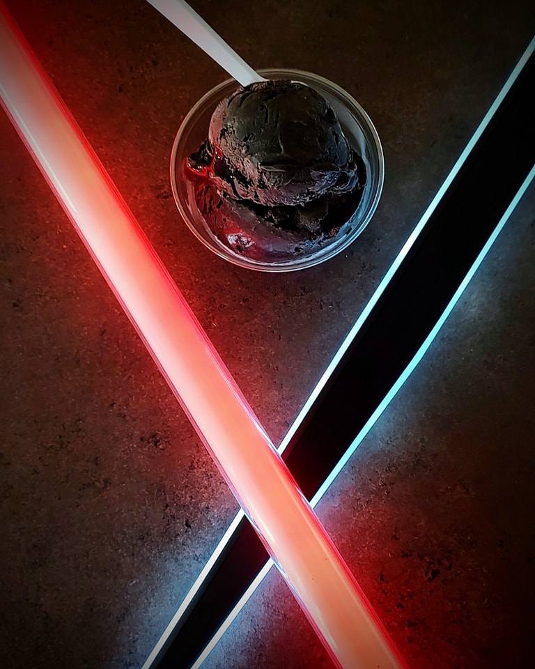 A dark side black Double Dark Dutch chocolate with a lightsaber red raspberry swirl.